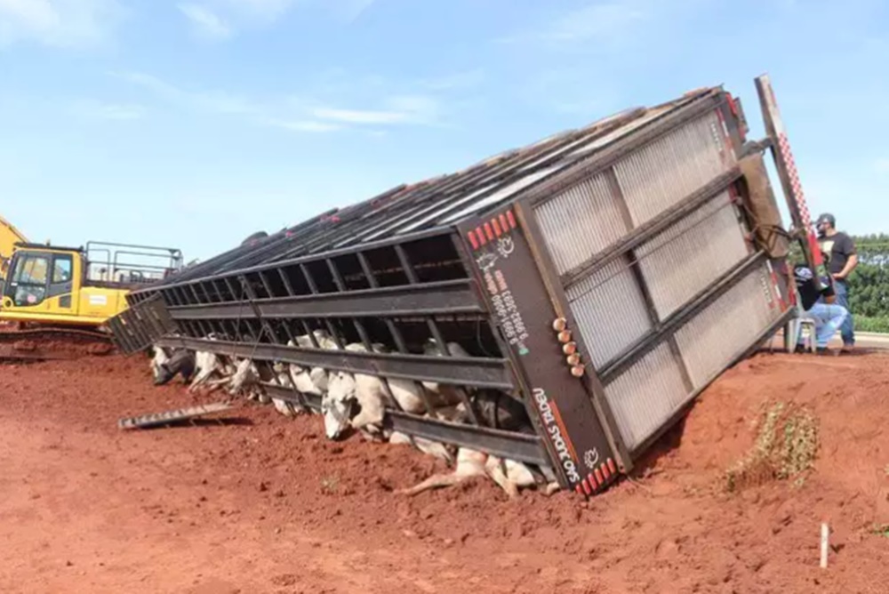 Carreta carregada com 80 bois tombou na madrugada deste sábado (21), no km 511 da rodovia, em Jaraguari, na região Norte do Estado, próximo à entrada para Rochedinho. O local está em obras.