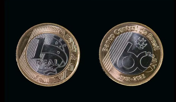 “O anverso [frente] apresenta em destaque o selo comemorativo dos 60 anos do BC, acompanhado da marca da Instituição e de linhas diagonais. O anel dourado contém as legendas ‘Banco Central do Brasil” e “1965-2025’. Já o reverso é igual ao de uma moeda padrão de R$ 1 da segunda família”, informou a instituição.