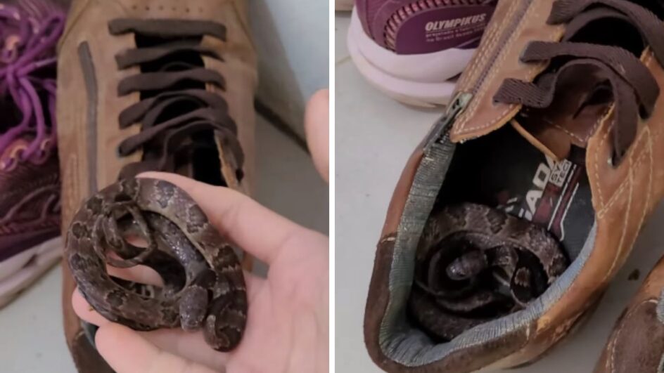 O biólogo Gilberto Ademar Duwe ficou responsável por fazer o resgate da serpente. Em vídeo publicado nas redes sociais no último sábado (5), ele mostra dois pares de calçados e bate com cuidado cada um deles. Ao chocar o sapato no chão, a cobra “cai” da ponta do sapato e se mostra.