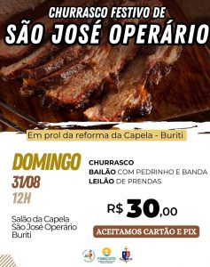A comunidade de São José Operário, promoverá neste domingo, 31 de agosto, a partir das 9h, um grande Churrasco Festivo com o objetivo de arrecadar