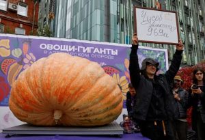 Alexander Chusov posa ao lado da sua abóbora de 969 kg — Foto: REUTERS/Yulia Morozova Uma abóbora gigante de 969 kg, apelidada de “Kisamor”, bateu um