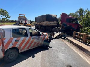 Um motorista ficou gravemente ferido e preso às ferragens após um acidente impressionante ocorrido na manhã desta quarta-feira (18), na BR-163, no quilômetro 821, próximo