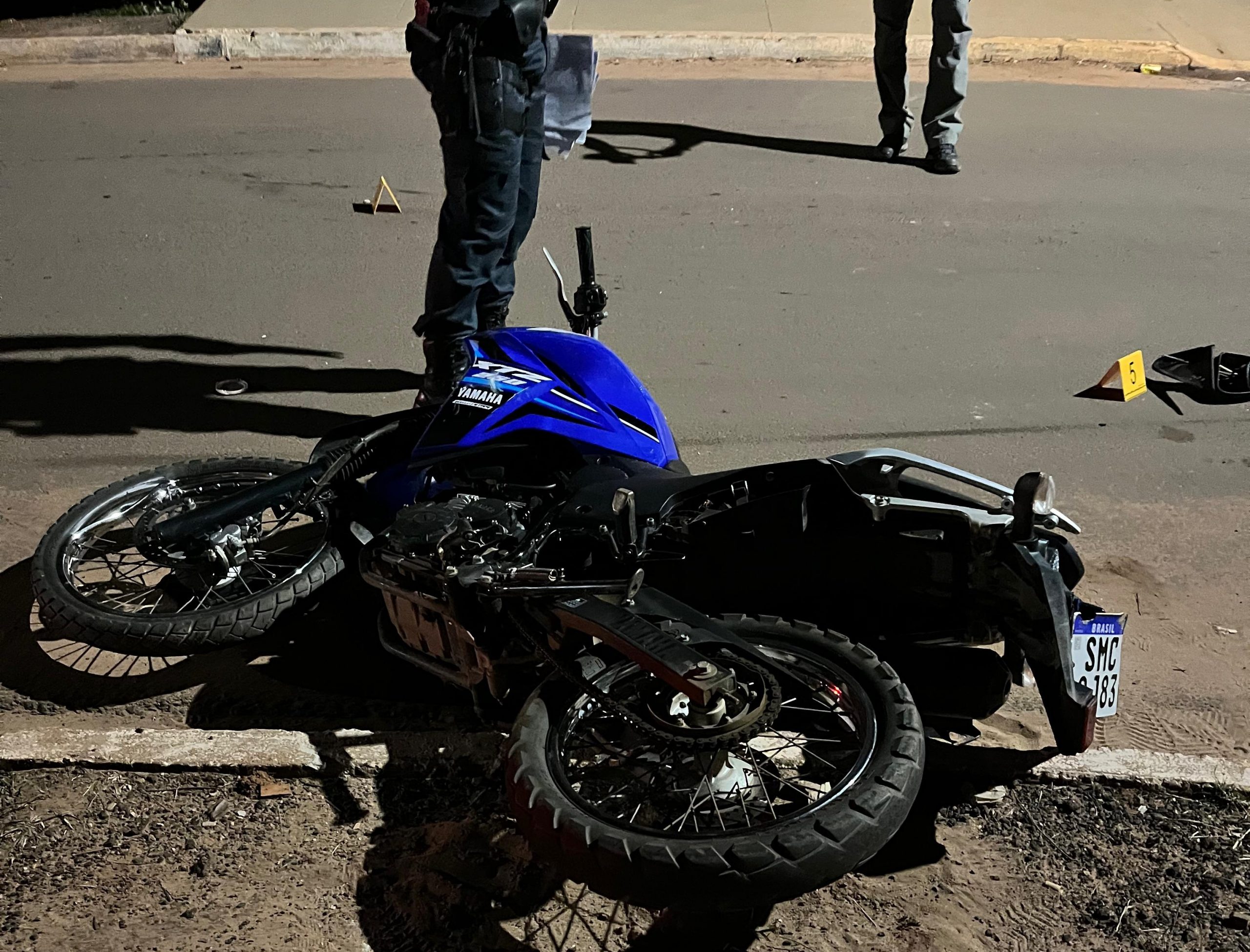 Uma colisão frontal entre uma motocicleta Yamaha XTZ e um veículo Chevrolet Celta deixou um homem gravemente ferido na noite desta terça-feira (13), na rua Frei Cirino João Primon, no bairro Vila Bela, em Coxim.