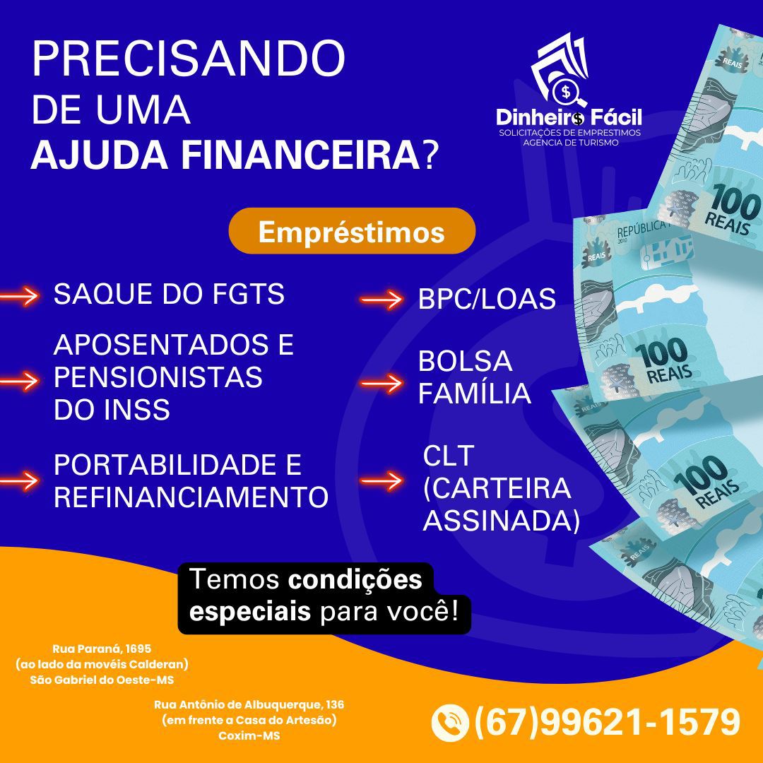 Para quem está precisando de uma ajuda financeira, a Dinheiro Fácil está oferecendo diversas opções de empréstimos com condições especiais. A empresa atende aposentados e pensionistas do INSS, beneficiários do BPC/LOAS, Bolsa Família, trabalhadores com carteira assinada (CLT) e pessoas que desejam realizar saque do FGTS, além de portabilidade e refinanciamento de contratos.