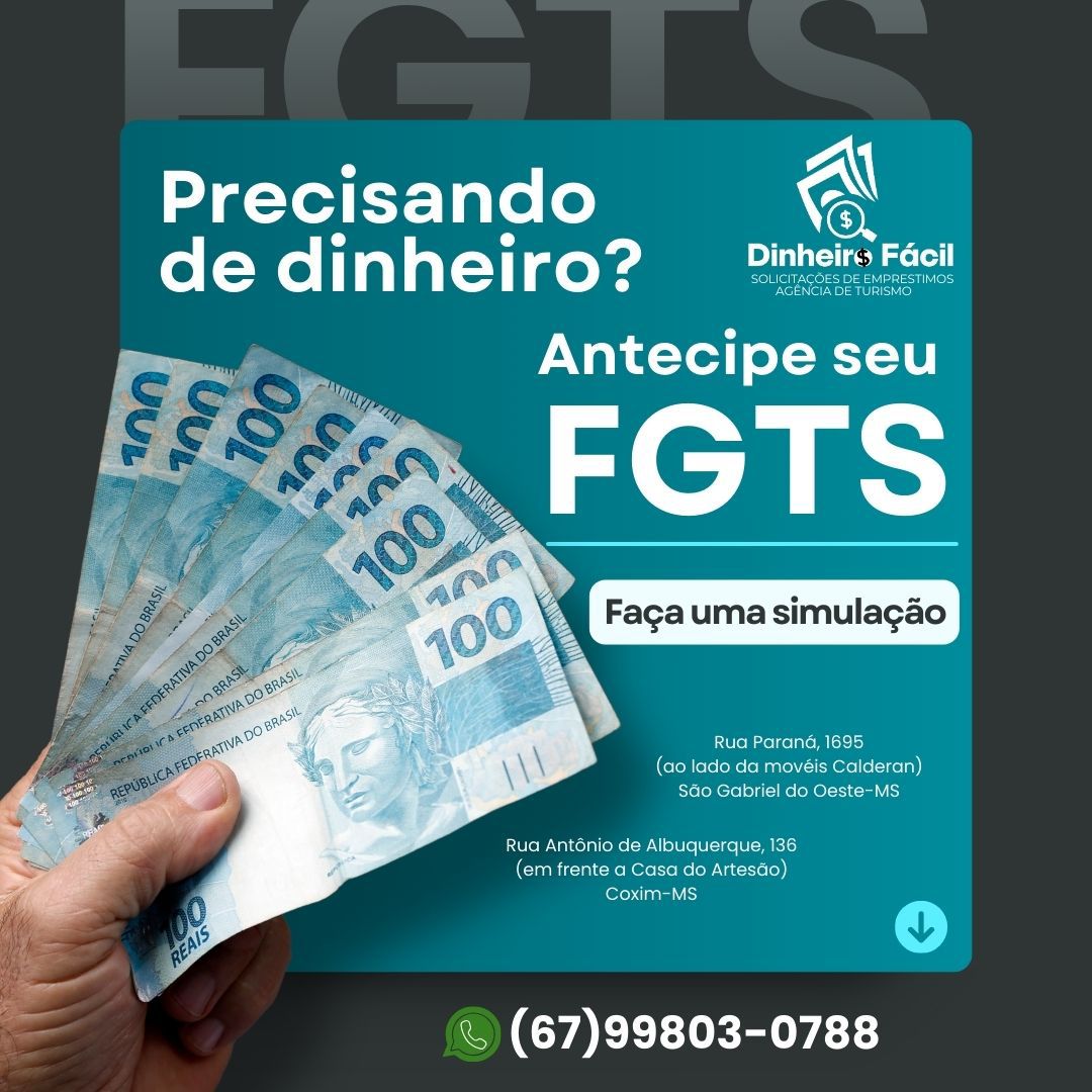 Moradores de São Gabriel do Oeste e Coxim, no Mato Grosso do Sul, que estão precisando de dinheiro podem contar com uma nova opção de crédito. A empresa Dinheiro Fácil, especializada em solicitações de empréstimos, está oferecendo o serviço de antecipação do FGTS (Fundo de Garantia do Tempo de Serviço).