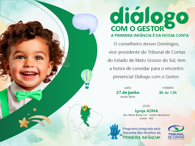 A cidade de Coxim sediará nesta sexta-feira (27), das 8h às 12h, o evento “Diálogo com o Gestor – A Primeira Infância é da Nossa Conta”, promovido pelo Tribunal de Contas do Estado de Mato Grosso do Sul (TCE-MS). O encontro será realizado na Igreja ADNA, localizada na Rua Mário Bacha, no bairro Jardim Aeroporto.