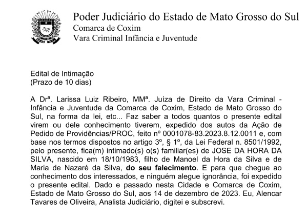 O Fórum da Comarca de Coxim informa o falecimento de José da Hora da Silva conforme os dispostos no artigo 3º, § 1º, da Lei Federal n. 8501/1992.