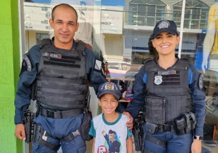 Enquanto os policiais realizavam o trabalho, um menino que é admirador da PM se aproximou dos policiais para tirar uma foto.