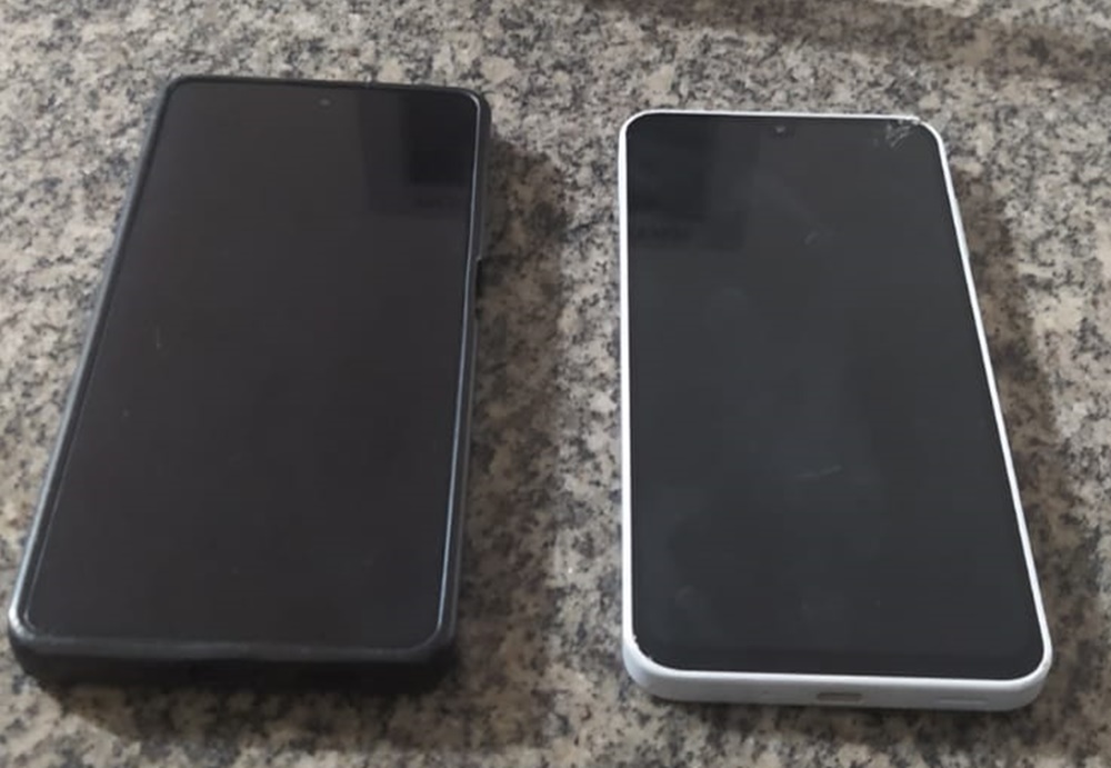 Durante a abordagem, o celular roubado foi encontrado com os suspeitos. A vítima reconheceu tanto os autores quanto o aparelho, confirmando o crime. Nenhuma arma foi localizada com os envolvidos.
