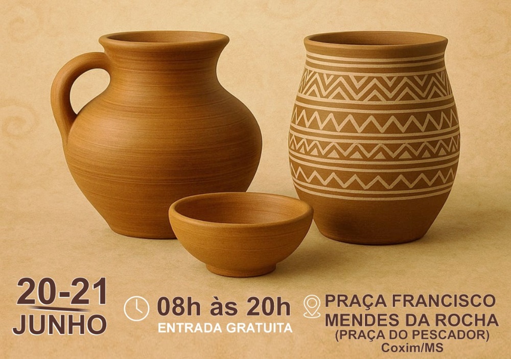 Coxim (MS) – Nos dias 20 e 21 de junho, a Praça Francisco Mendes da Rocha, popularmente conhecida como Praça do Pescador, no bairro Piracema, será palco da Primeira Exposição de Artesanato Cerâmico da Associação Espaço das Artes, com o tema: “A Cerâmica que Encanta – Peças Feitas à Mão com Barro, Alma e Identidade Regional”.
