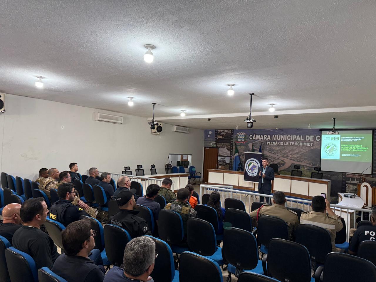 Na manhã da última terça-feira (08), o Plenário da Câmara Municipal de Coxim foi palco da reunião ordinária bimestral do Gabinete de Gestão Integrada de Fronteiras e Divisas (GGI-FRON-DIV), Polo Coxim. O encontro reuniu representantes das forças de segurança pública de Mato Grosso do Sul, Mato Grosso e Goiás, com o objetivo de discutir ações integradas no enfrentamento aos crimes transnacionais e locais que atuam na região de divisas entre os estados.