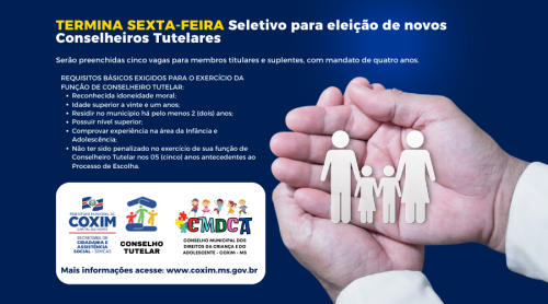 Termina nesta sexta-feira (28) o Seletivo para escolha de novos Conselheiros Tutelares de Coxim. A inscrição deve ser feita, pessoalmente, na Casa dos Conselhos, localizada a rua Feliciano Serrou Camy, s/n°, Bairro Flávio Garcia.