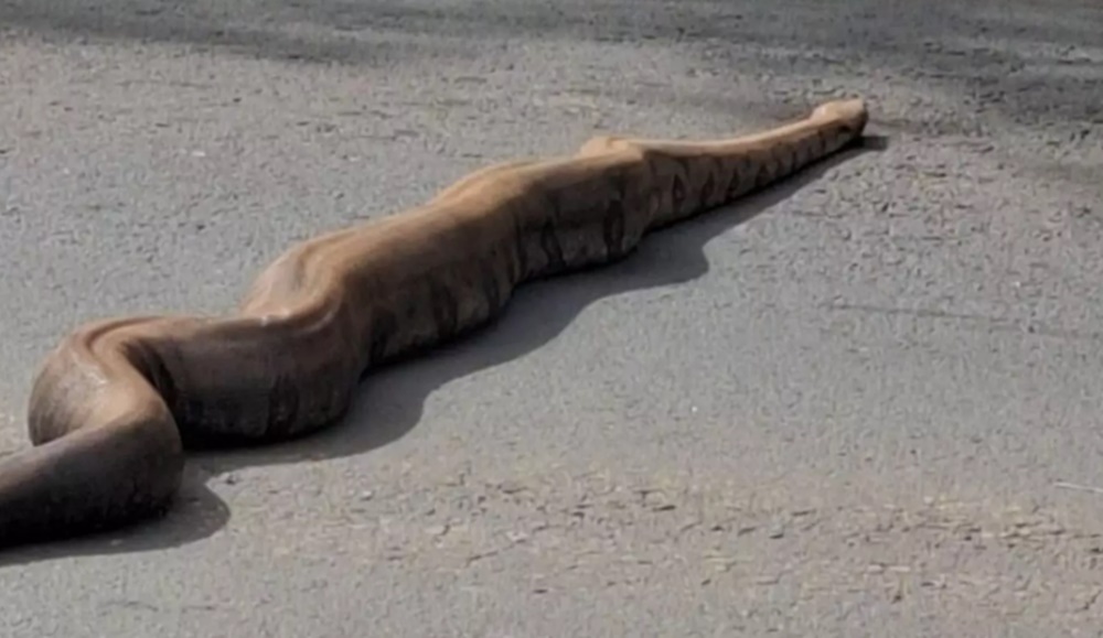 Conforme imagens enviadas ao Jornal Midiamax, o animal, de aparentemente 2 metros, aparece rastejando pelo asfalto quente, em direção à sombra fresca das árvores, do outro lado da rua.