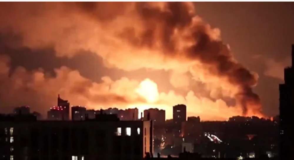 Vídeos compartilhados nas redes sociais pelo serviço de emergência estatal da Ucrânia mostram bombeiros lutando para apagar incêndios em Kiev após o ataque em larga escala da Rússia durante a noite.