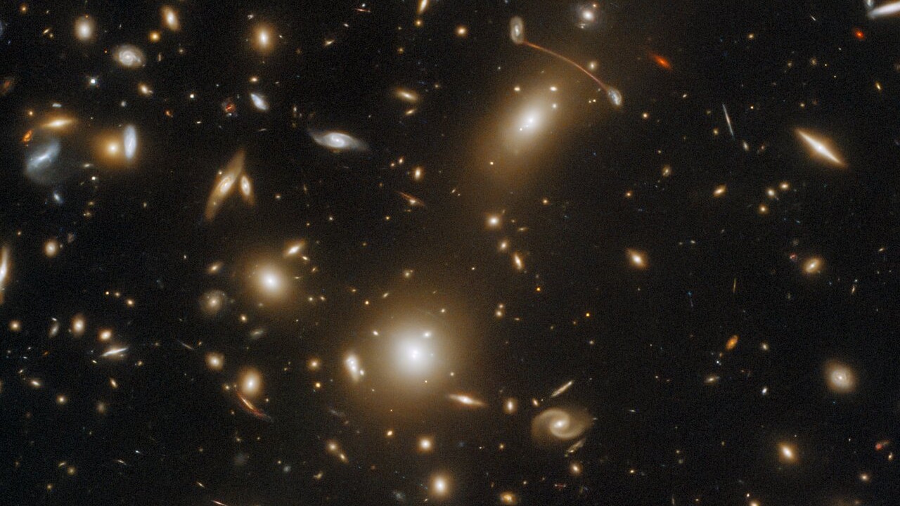 O enorme aglomerado de galáxias Abell 1351 está localizado na Constelação da Ursa Maior, a cerca de 4 bilhões de anos-luz de distância. Nesta imagem, o que se vê como raios de luz são, na verdade, galáxias distantes. As listras são o resultado de lentes gravitacionais, um fenômeno astrofísico que ocorre quando um corpo celeste muito massivo, como um aglomerado de galáxias, distorce o espaço-tempo com força suficiente para afetar o caminho da luz que passa por ele. O fenômeno faz com que a luz pareça passar por uma lente gigantesca (Crédito: Esa/Nasa)