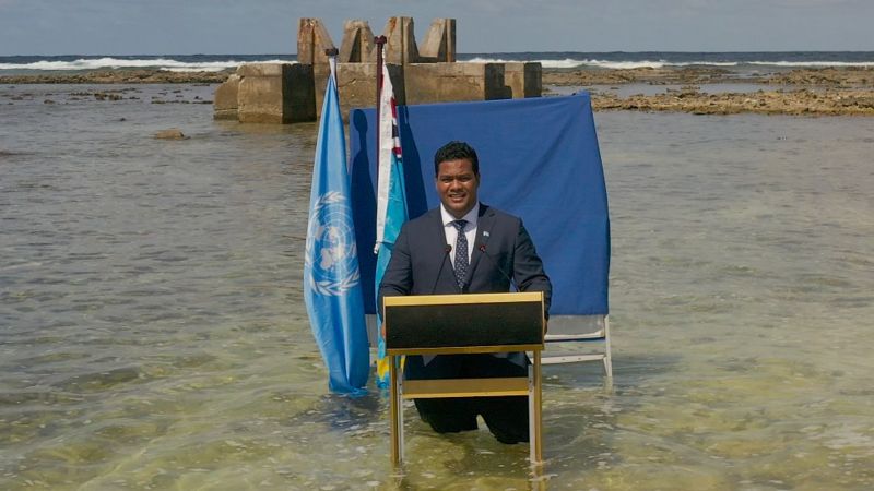 O Ministro da Justiça, Comunicações e Relações Exteriores de Tuvalu, Simon Kofe, enviou uma mensagem dramática à COP26, a recente cúpula sobre mudança climática em Glasgow, na Escócia.