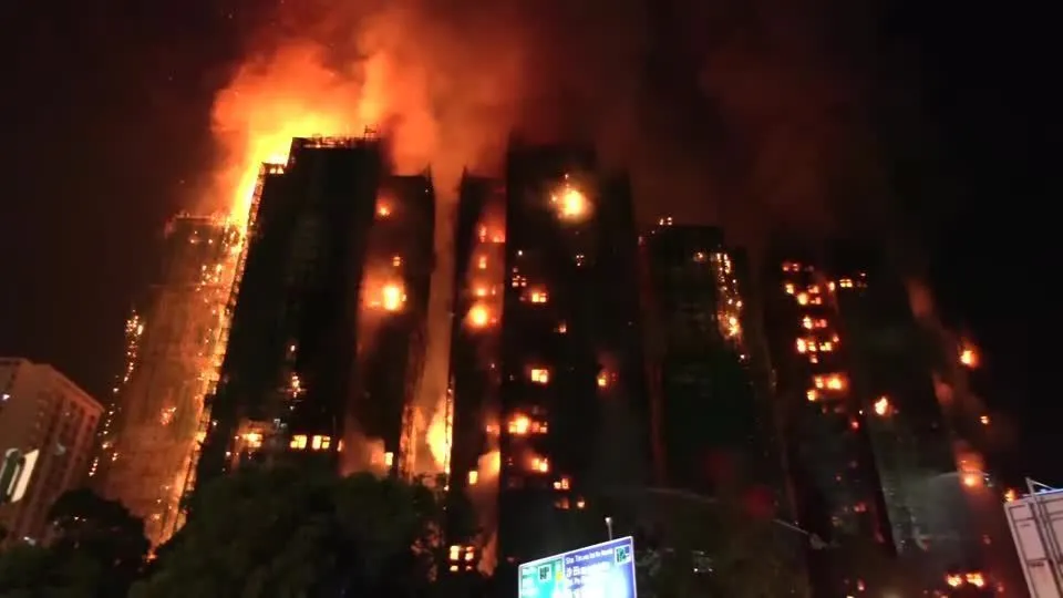 Incêndio em complexo residencial em Hong Kong continua a noite. (Foto: Reprodução/Reuters)