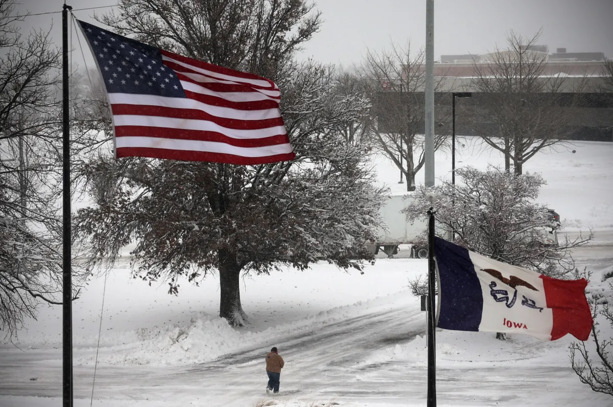 Pessoa caminha na neve e com fortes ventos enquanto uma tempestade de inverno se move pelo meio-oeste dos Estados Unidos, em Des Moines, Iowa, EUAREUTERS/Mike Segar • REUTERS