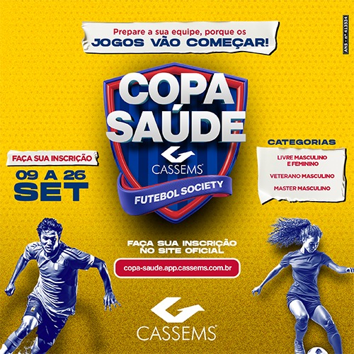 As equipes interessadas em participar da 16ª edição da Copa Cassems já podem se inscrever para a disputa do campeonato. As inscrições, que vão até o dia 26 de setembro, custam R$ 300,00 e podem ser feitas pelo site oficial saude.app.cassems.com.br, na barra “Inscrições”. O pagamento pode ser feito via PIX ou transferência bancária.