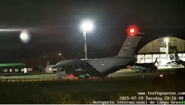 Um avião cargueiro C-17 Globemaster III da Guarda Aérea Nacional dos Estados Unidos pousou no início da noite desta terça-feira (29) no Aeroporto Internacional de Campo Grande. A aeronave chegou transportando equipamentos e helicópteros que serão usados no Exercício Tápio 2025, operação militar que reúne forças do Brasil e dos EUA.