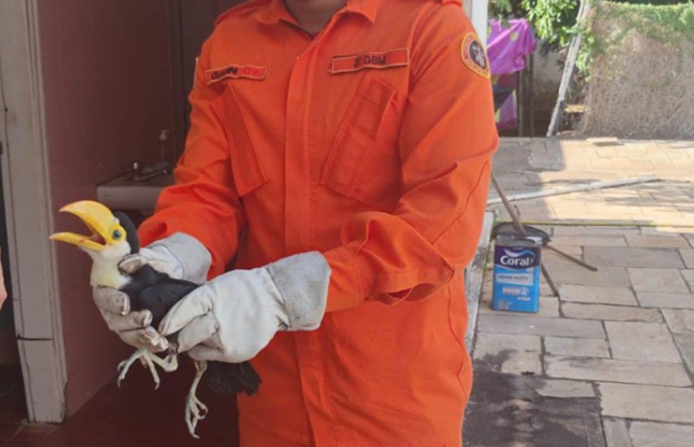 A ocorrência foi registrada por volta das 16h. Um filhote de tucano estava no chão após ter caído do ninho. A ave não conseguia voar de volta para o local onde os pais permaneciam.