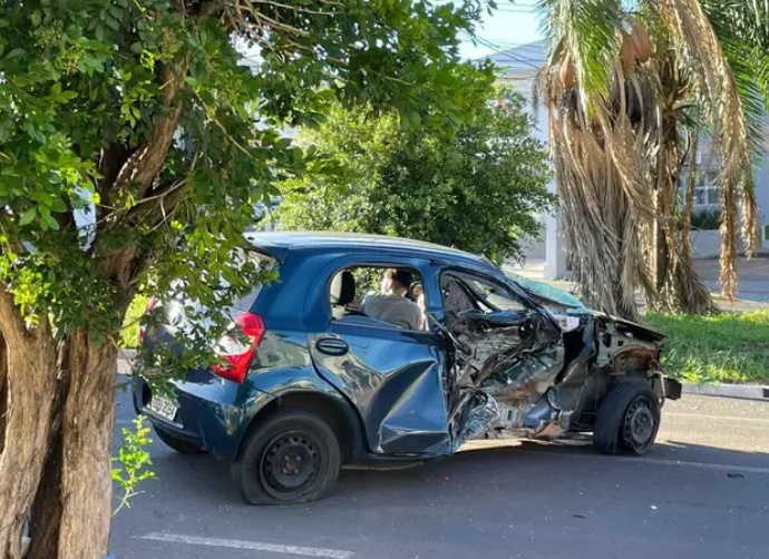 Condutor de um veículo Toyota Etios, que estava sem documento, atingiu dois postes, um de sinalização e outro de energia elétrica, na manhã desta sexta-feira no cruzamento da Avenida Mato Grosso com a Rua Espírito Santo, no Centro de Campo Grande. As três faixas no sentido Centro precisaram ser interditadas.