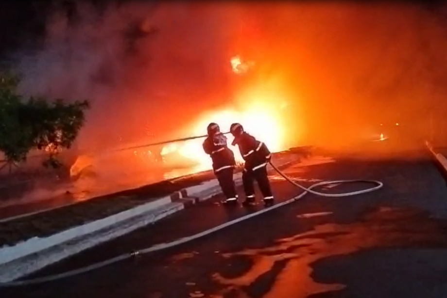 Incêndio de grandes proporções atingiu dois ônibus, na noite desta segunda-feira (28), na rua Antônio João, Centro, em Corumbá, município localizado a 416 quilômetros de Campo Grande.