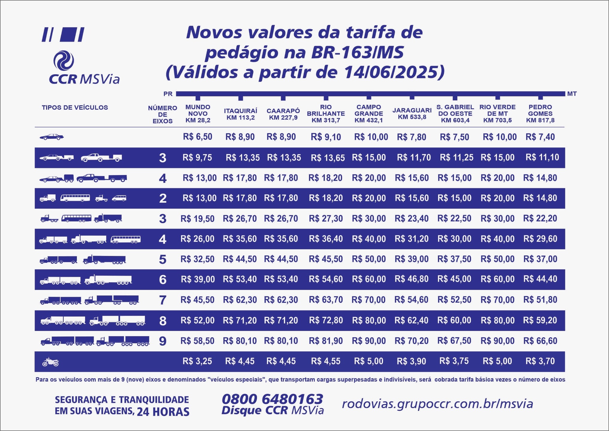 A partir da zero hora deste sábado (14), os motoristas que trafegam pela BR-163 em Mato Grosso do Sul vão pagar mais caro nos pedágios administrados pela CCR MSVia, agora sob controle da empresa Motiva. A alteração foi autorizada pela ANTT (Agência Nacional de Transportes Terrestres) e aplica-se a todas as praças ao longo da rodovia.