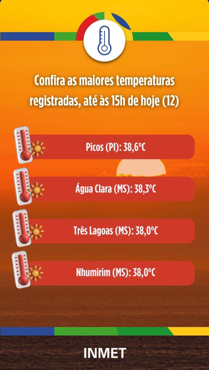 Na última terça-feira (11), quatro cidades de MS também fizeram parte do Top 10 entre as maiores temperaturas do País: Corumbá (38,2ºC), Porto Murtinho (38,2ºC), Nhumirim (38,1ºC), Coxim (37,8ºC) e Paranaíba (37,2ºC).