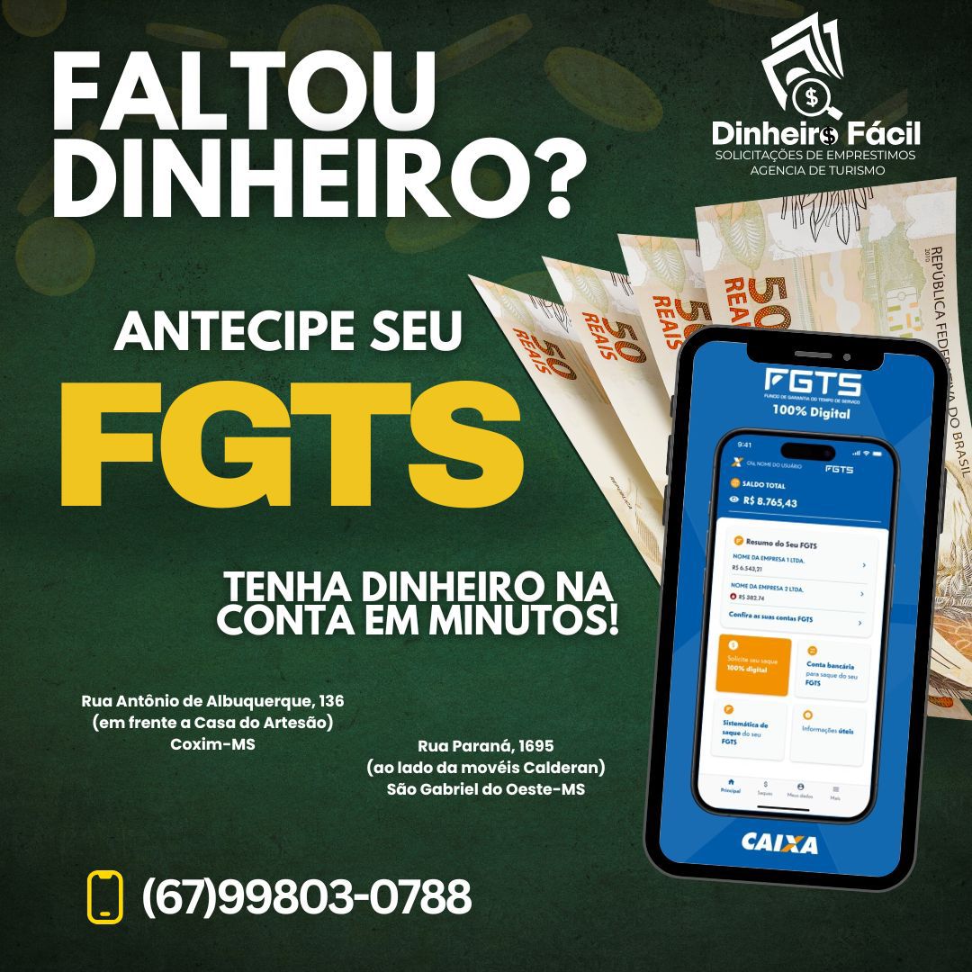 Com atendimento nas cidades de Coxim e São Gabriel do Oeste, a Dinheiro Fácil atua como facilitadora para quem deseja antecipar o saque-aniversário do Fundo de Garantia por Tempo de Serviço (FGTS), sem burocracia e com toda a segurança. O processo é 100% digital e os valores são liberados de forma prática, diretamente na conta do solicitante.