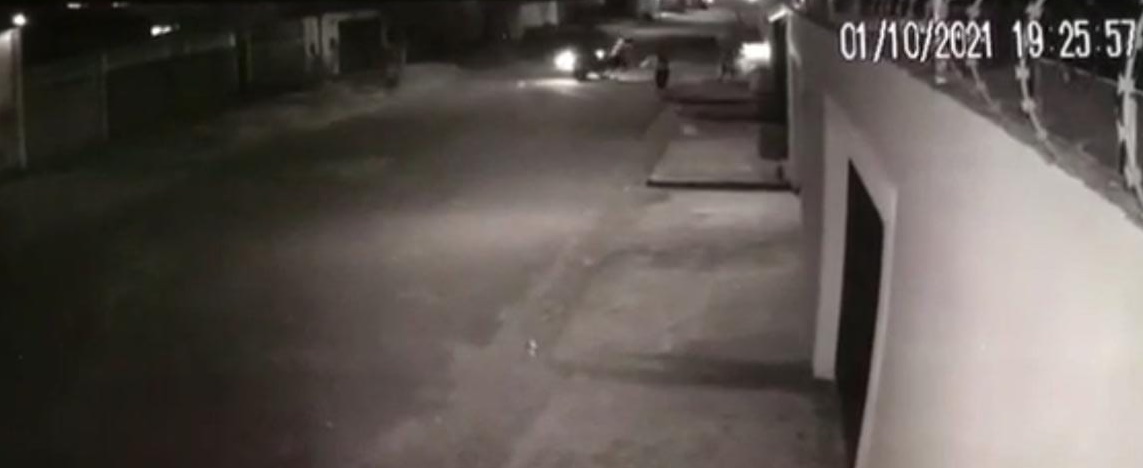 Nas imagens do circuito de segurança de uma residência é possível ver o momento em que a policial caminha com o filho na rua e é abordada por um bandido em uma motocicleta.