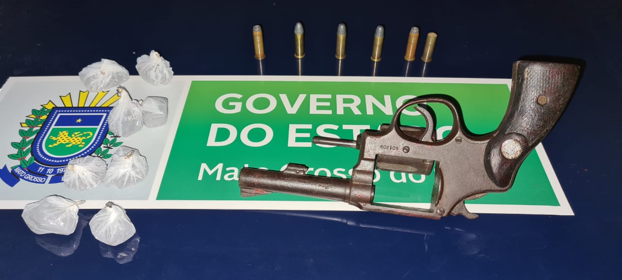 O revólver calibre 38 Taurus com 3 munições intactas, uma deflagrada e 2 picotadas (não deflagrada), além de 8 porções de maconha foram apreendidos.