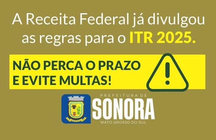 A Prefeitura de Sonora informa que a Receita Federal já divulgou as regras para a Declaração do Imposto sobre a Propriedade Territorial Rural (DITR) 2025. O prazo para entrega da declaração terá início em 11 de agosto de 2025 e se encerrará em 30 de setembro de 2025.