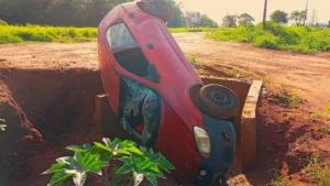Um veículo modelo GM/Celta de cor vermelha foi encontrado numa canaleta de águas pluviais, em um acidente que teria ocorrido entre a noite de domingo
